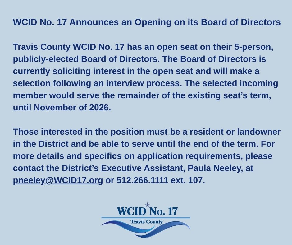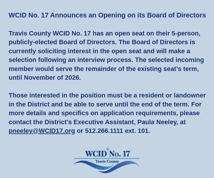 Travis County WCID No. 17 has an open seat on their 5-person, publicly-elected Board of Directors. The Board of Directors is currently soliciting interest in the open seat and will make a selection following an interview process. The selected incoming member would serve the remainder of the existing seat’s term, until November of 2026.