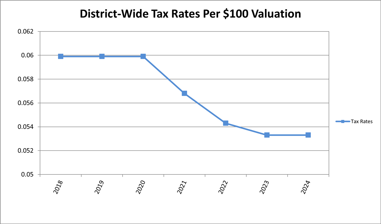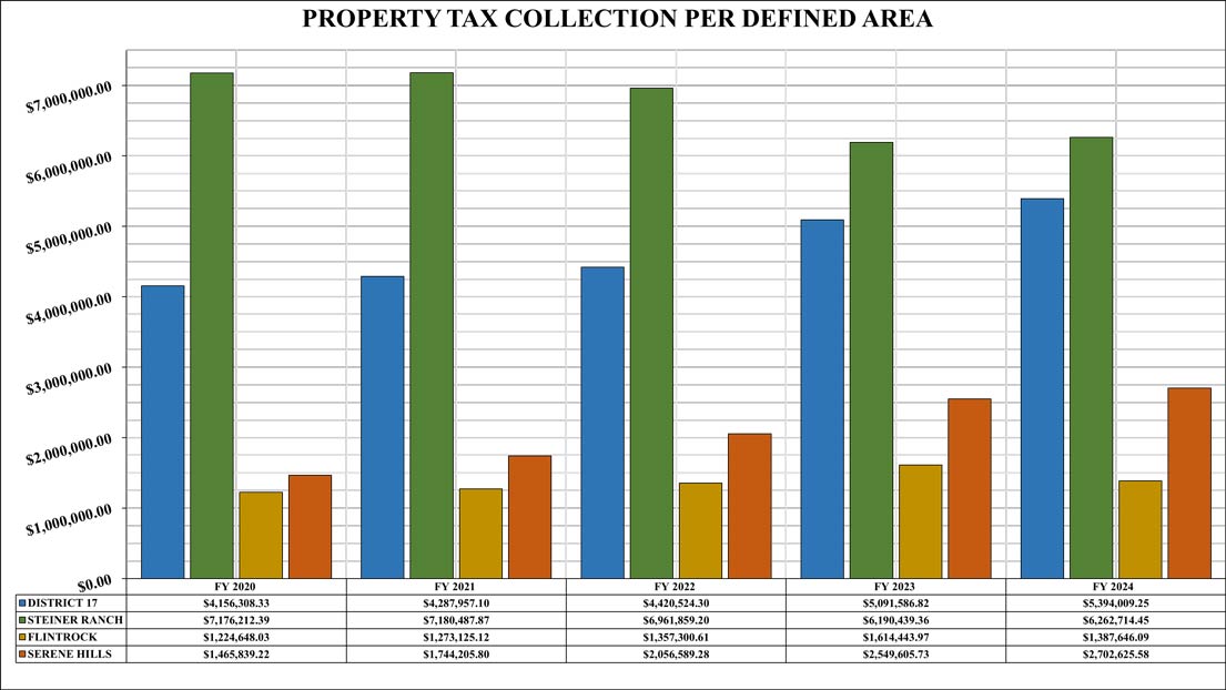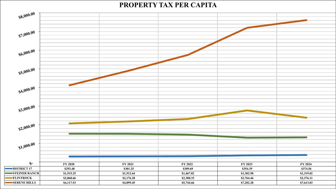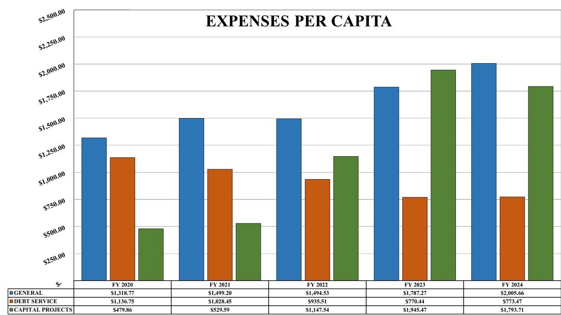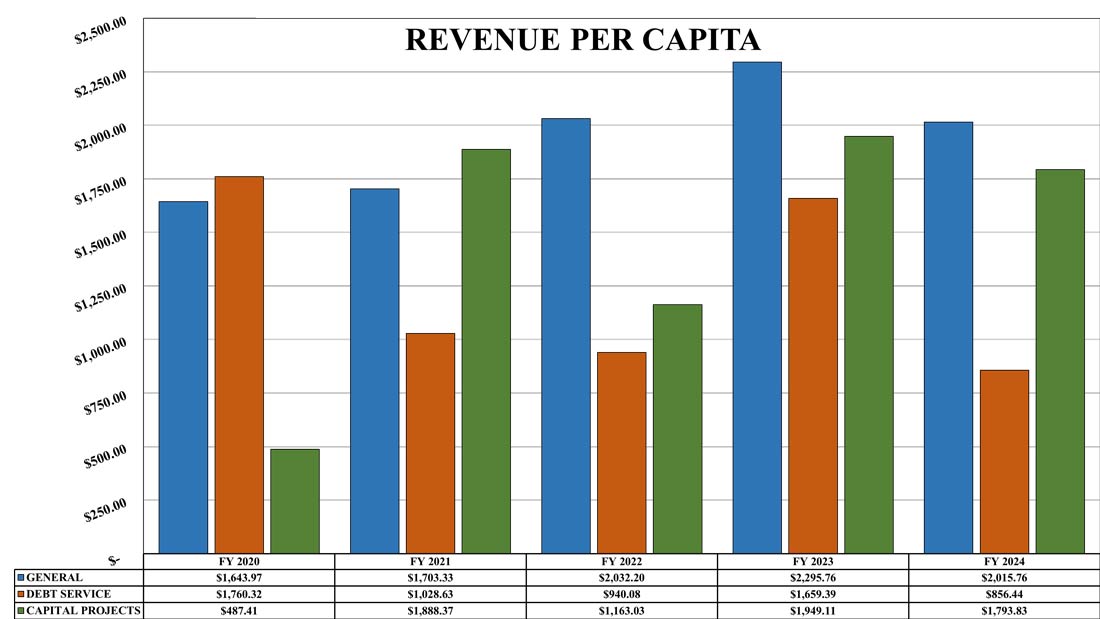 Below are charts to show the past five years of Revenue and Expenses by fund per capita (General Fund, Debt Service Fund and Capital Projects Fund Per number of District Wide Customers) and tax collections per capita per defined area (based on a number of parcels in each defined area) as well as the number of Full Time Equivalent (FTE’s) over the previous five years.