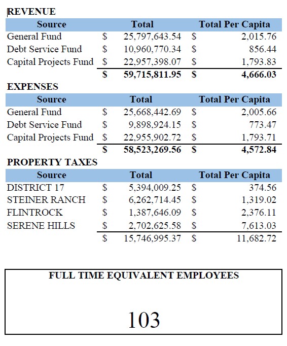 The District has three main funds, The General Fund, for normal operating expenses, the Debt Service Fund for debt service collection and payments, and the Capital Projects Fund for capital projects and construction. The General Fund contains normal operating revenues and expenditures and general operating items. The General Fund also encompasses the Operations and Maintenance reserves that may be needed to be used for any of the mentioned funds. The Debt Service Fund receives property tax revenue as designated by specific defined areas to pay the bond payments associated with that area. The Capital Project Fund is designated specifically for capital projects. Any bond proceeds related to capital projects are received, allocated, and expensed as appropriated in this fund. Note that the District does not receive any sales tax revenues, but collects them from customers who opt into the trash service with us as they are pass-through collected for and paid to our third-party trash collection company.