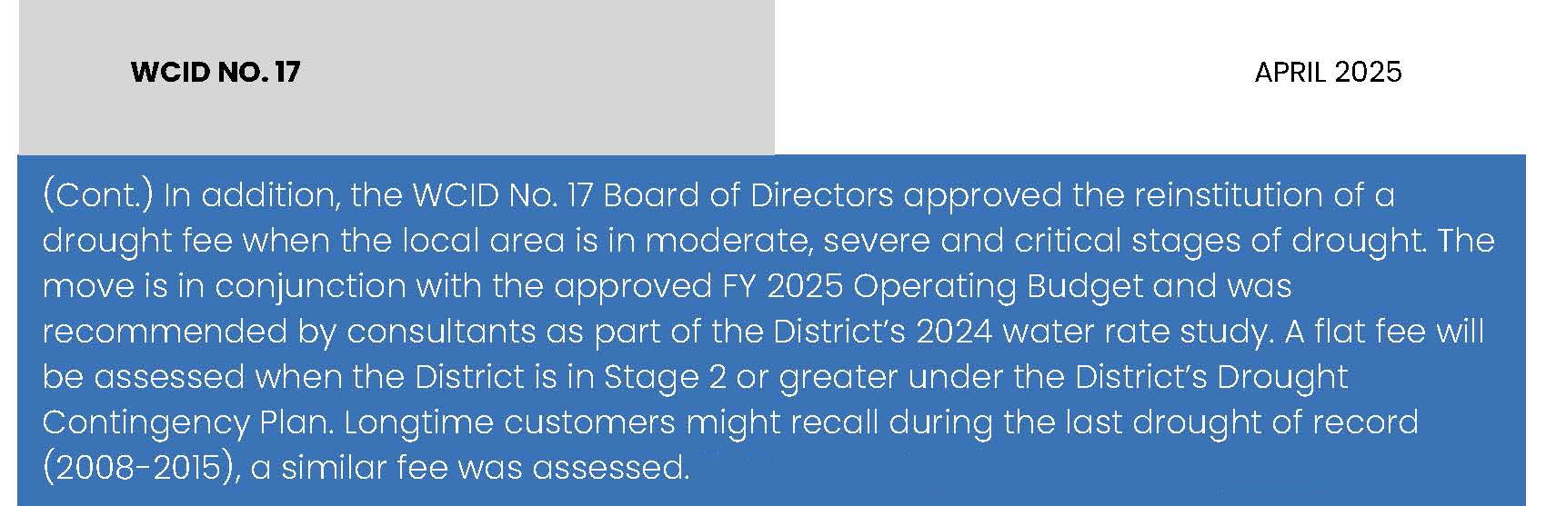 See rates: https://www.wcid17.org/rates-fees/